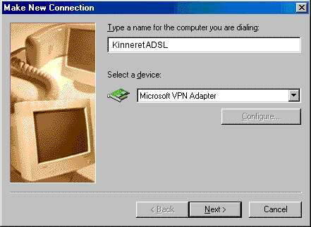 !!! בל ומיש יצבק וא הנקתהה קסיד םכתושרב אדוול שי הנקתהה ךילהת תליחת ינפל .הלעפהה תכרעמ לש הנקתהה :תשר תורדגה .א . "Control Panel" < (תורדגה) "Settings" < (לחתה) "Start" רותפכ לע וצחל .1 .(תשר) "Network"-ל וסנכיה .2 וצחלו "TCP/IP" תא ונמס .(יללכ) "General" תינושלל רובענ חתפנש ןולחב .3 .(םינייפאמ) "Properties" רותפכ לע ![]() :םדומה תנקתה .א ."IP Address" תינושלל ורבע .4 .(IP-ה תבותכב ןייצ) "Specify an IP address" לש תורשפאב רחבנ .5 ![]() "10.0.0.2" (תואכרמ אלל) םושרנ (IP תבותכ) "IP Address" הדשב .6 "255.0.0.0" (תואכרמ אלל) םושרנ (הנשמ תכסמ) "Subnet Mask" הדשב .7 10.0.0.138 - םושרנ (לדחמ תרירב רעש) "Default gateway" הדשב .7 תורשפאה תנמוסמ יכ וקדבו (Wins תרוצת) "Wins Configuration" תינושלל ורבע .8 .(לטובמ) "Disable" לש ןאכ םג יכ וקדבו (DNS-ל תרוצת) "DNS Configuration" תינושלל ורבע תעכ .9 .(לטובמ) "Disable" לש תורשפאה תנמוסמ .תונולחה ינשב (רושיא) "OK" לע ץחלנ םויסל .10 :ןגייח תרדגה .ב .(ילש בשחמה) "My Computer"-ל וסנכיה .1 .(תשרל גויח) "Dial-Up Networking"-ב רחבנ חתפנש ןולחב .2 .(השדח תורשקתה תריצי) "Make New Connection" לע וצחל .3 Kinneret ADSL - ומשר (...בשחמה רובע םש דלקה) " Type a name for" הדשב .4 ![]() "Microsoft VPN Adapter"-ב רוחבל שי (ןקתה רחב) "Select a device" הדשב .5 .(אבה) "Next" רותפכ לע וצחל ןכמ רחאלו !!! בל ומיש קלחל ורבעו (לוטיב) "Cancel" לע וצחל ,תמייק אל וז תורשפאו הדימב לכ תא שדחמ ועצב ןכמ רחאל .VPN-ה ביכר תא ןיקתהל ידכ ךירדמה לש .ה .ב ףיעסב תוראותמה תולועפה ןכמ רחאלו "RELAY_PPP1 10.0.0.138" (תואכרמ אלל) םושרל שי תעכ .6 .(אבה) "Next" לע וצחל ![]() .(םויס) "Finish" רותפכ לע וצחל םויסל .7 ![]() :ןגייחה ינייפאמ .ג .(ילש בשחמה) "My Computer"-ל וסנכיה .1 .(תשרל גויח) "Dial-Up Networking"-ב רחבנ חתפנש ןולחב .2 ."Properties"-ב ורחבו רבכעה לש ינמיה רותפכה םע ונרציש ןגייחה לע וצחל .3 ![]() .(םיתרש יגוס) "Server Type" תינושלל ורבע .4 ![]() תסיחדב שמתשה) "Enable software compression" לש תויורשפאה קר יכ ואדו .5 .תונמוסמ "TCP/IP"-ו (םינותנ ![]() .(TCP/IP תורדגה) "TCP/IP Settings" רותפכ לע וצחל .6 .(IP תורתוכ תסיחדב שמתשה) "Use IP header compression" לש ןומיסה תא ולטב .7 ![]() ןולחל רוזחל ידכ תונולחה ינשב (רושיא) "OK" רותפכ לע וצחל םויסל .8 .(תשרל גויח) "Dial Up Networking" ורחבו רבכעה לש ינמיה רותפכה םע וילע וצחל ,ונרציש ןגייחה תא ונמס .9 .(ךרד רוציק רוצ) "Create Shortcut"-ב .(ןכ) "Yes" לע וצחל חתפנש ןולחב .10 :טנרטניאל תורבחתה .ד רוביחל ךרדה רוציק לע רבכעה לש ילאמשה רותפכה םע םיימעפ וצחל .1 .הדובעה ןחלוש לע טנרטניאל (תואכרמ אלל) םושרל שי (שמתשמה םש) "Username" הדשב .2 .תרנכב םכלש שמתשמה םש אוה USERNAME רשאכ "USERNAME@IKinneret" ![]() .םכלש אמסיסה תא ומשר (אמסיס) "Password" תחת .3 .(רבחתה) "Connect" רותפכ לכ וצחל תורבחתהל .4 :"Microsoft VPN Adapter" ביכר תנקתה .ה בותכה תא עצבל ךרוצ ןיא ,החלצהב .ב ףיעסב ןגייחה תרדגה תא םתמייס םא .הז ףיעסב !!! בל ומיש יצבק וא הנקתהה קסיד םכתושרב אדוול שי הנקתהה ךילהת תליחת ינפל .הלעפהה תכרעמ לש הנקתהה לע רבכעה לש ילאמשה רותפכה םע םיימעפ וצחל הדובעה ןחלושב .1 .(ילש בשחמה) "My Computer"-ה ![]() .(הרקב חול) "Control Panel"-ל וסנכיה .2 ![]() .(תוינכות לש הרסה/הפסוה) "Add/Remove Programs" לע וצחל .3 ![]() ."Windows Setup" תינושלל ורבע .4 ."Details" רותפכ לע וצחלו (תרושקת) "Communication" לש תורשפאה תא ונמס .5 ![]() ."Virtual Private Networking" לש תורשפאה תא ונמס חתפנש ןולחב .6 ![]() הלעפה ועצב ושקבתתשכו ,תונולחה ינשב (רושיא) "OK" רותפכ לע וצחל .7 .בשחמה לש שדחמ .ןגייחה תא רידגהל ידכ .1.ב ףיעסל ורזיח .8 |
